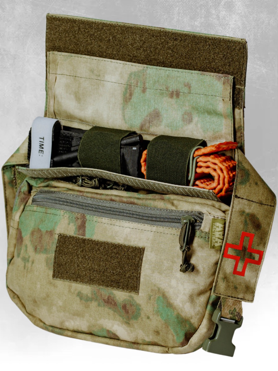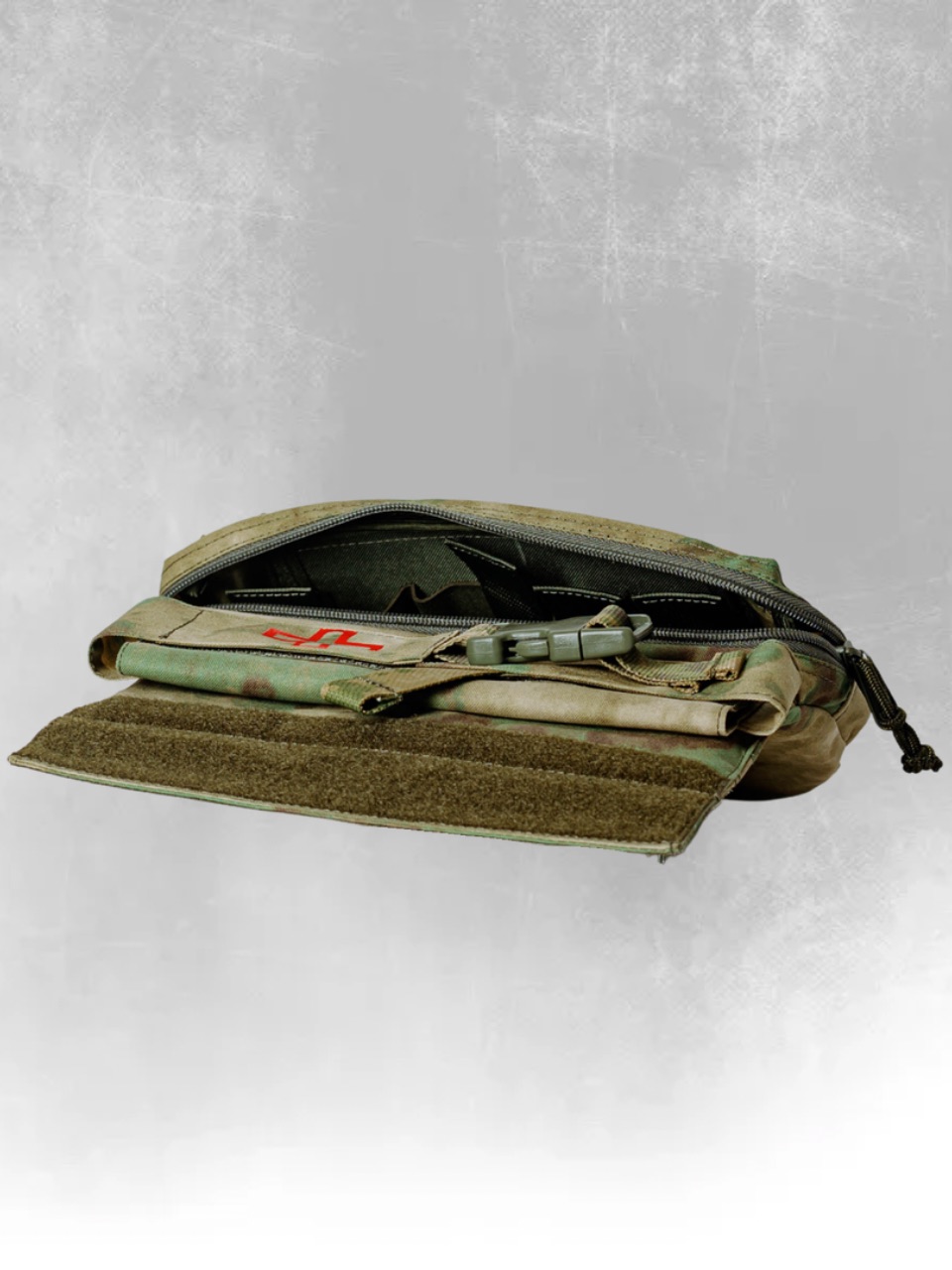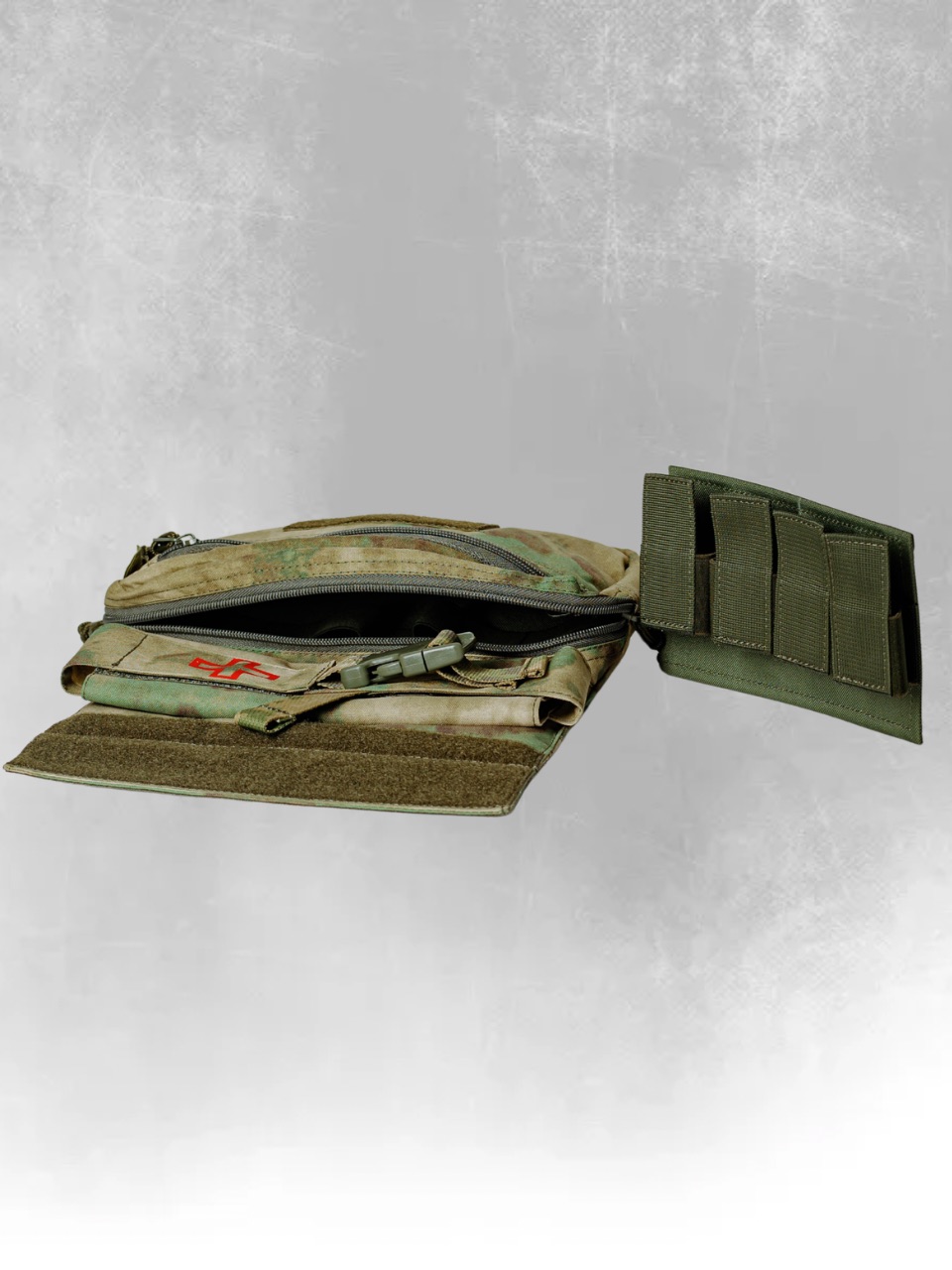 Напашный подсумок «Белбог» — комбинированное изделие из двух частей, крепится на плитник или бронежилет контактной лентой в области живота. Изготовлен из высокопрочного нейлона.